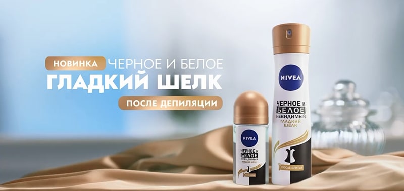 — А все благодаря новинке Nivea Черное и Белое — Гладкий шелк, который защищает от пятен, а еще ухаживает за моей кожей после депиляции. Невероятная гладкость.